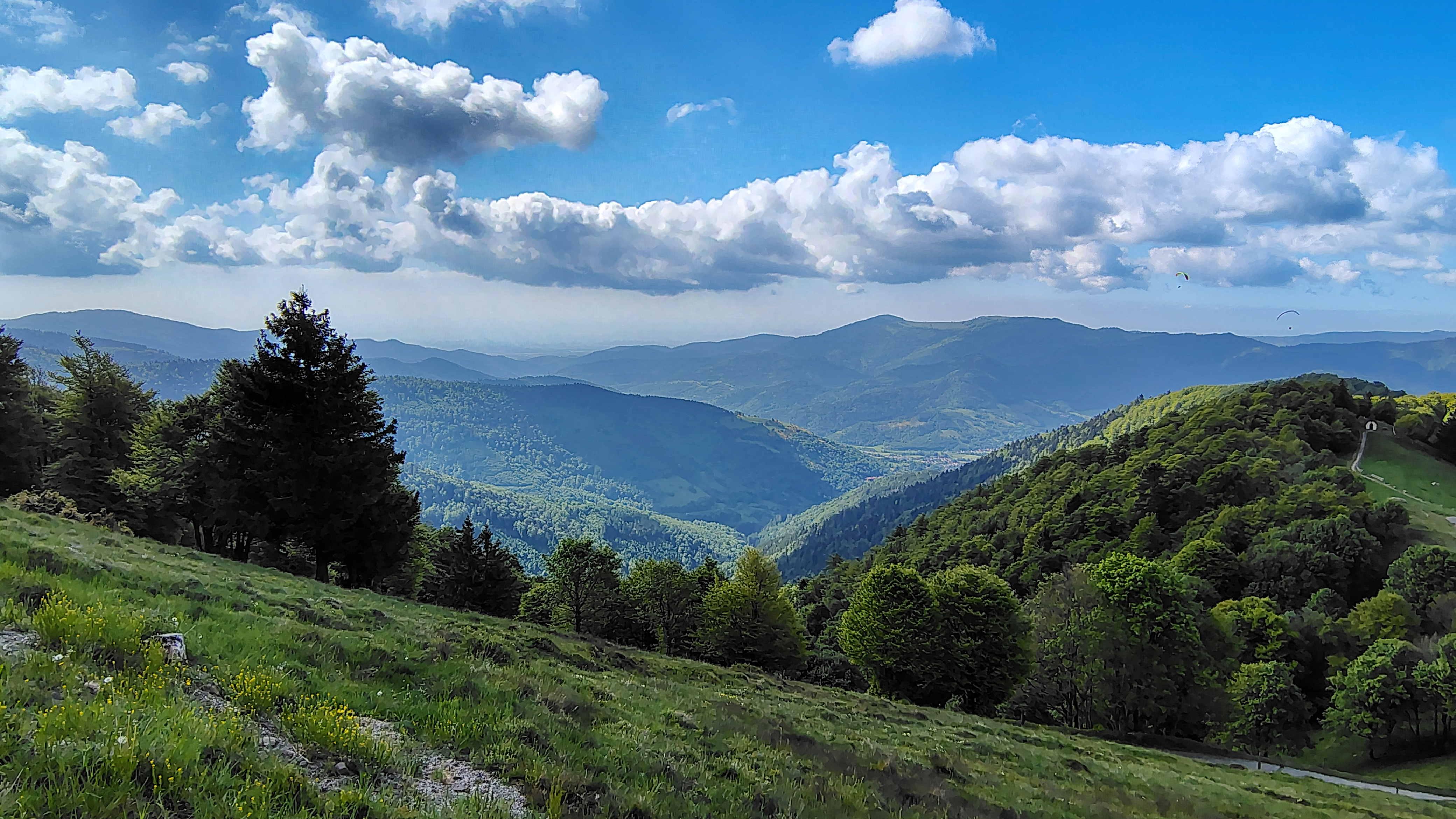 Direction le Markstein, où certains ont eu la chance d’apercevoir des parapentes prenant leur envol, entre ciel et virages. Une occasion rêvée de faire une pause photo. Puis, changement de rythme en bifurquant sur une route discrète au milieu de la forêt menant au cœur de charmants villages alsaciens.